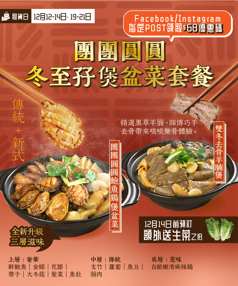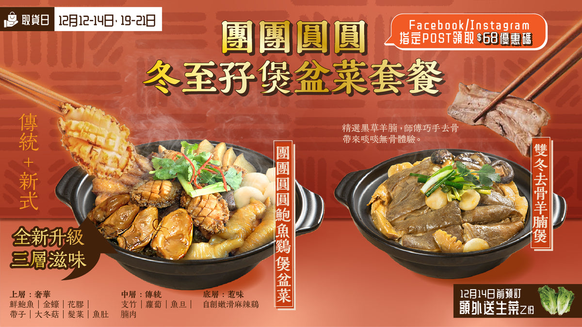 【秋冬招牌】孖煲兄弟套餐 - 雙冬去骨羊腩煲 + 花膠鮑魚麻甩雞煲